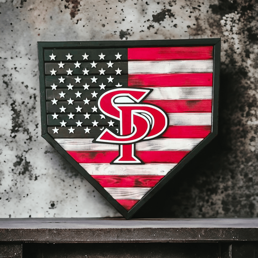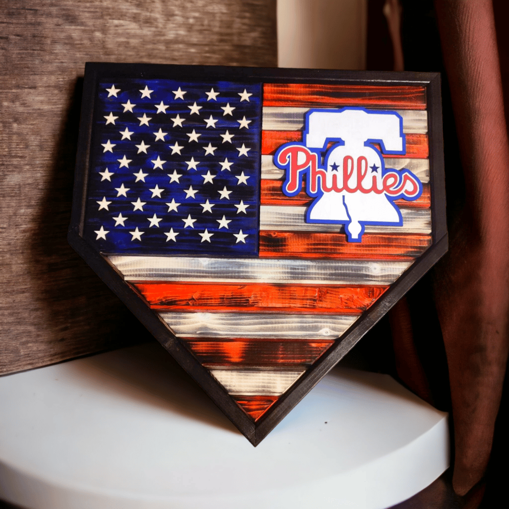 Show off your love for America and your baseball team, with this unique handmade wooden American flag in the shape of a baseball home plate!