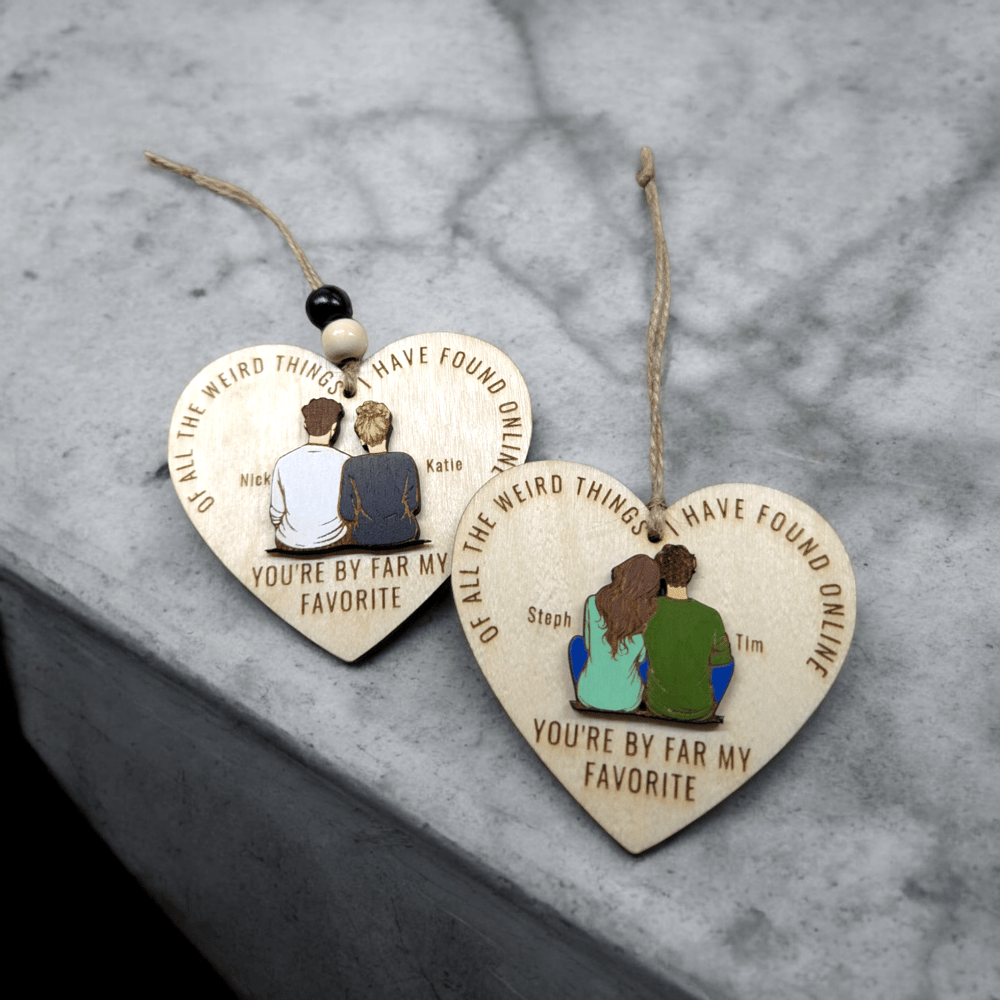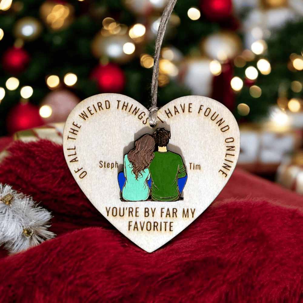 “We met online” a modern day love story. Celebrate the love you’ve discovered online with this charming and heartfelt wooden ornament. Crafted from high-quality wood, this ornament features a heart-shaped design with a beautifully engraved phrase: "Of all the weird things I have found online, you're by far my favorite."