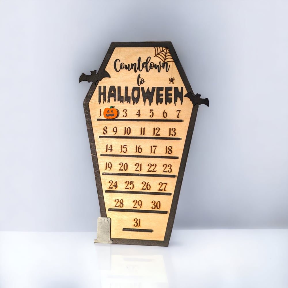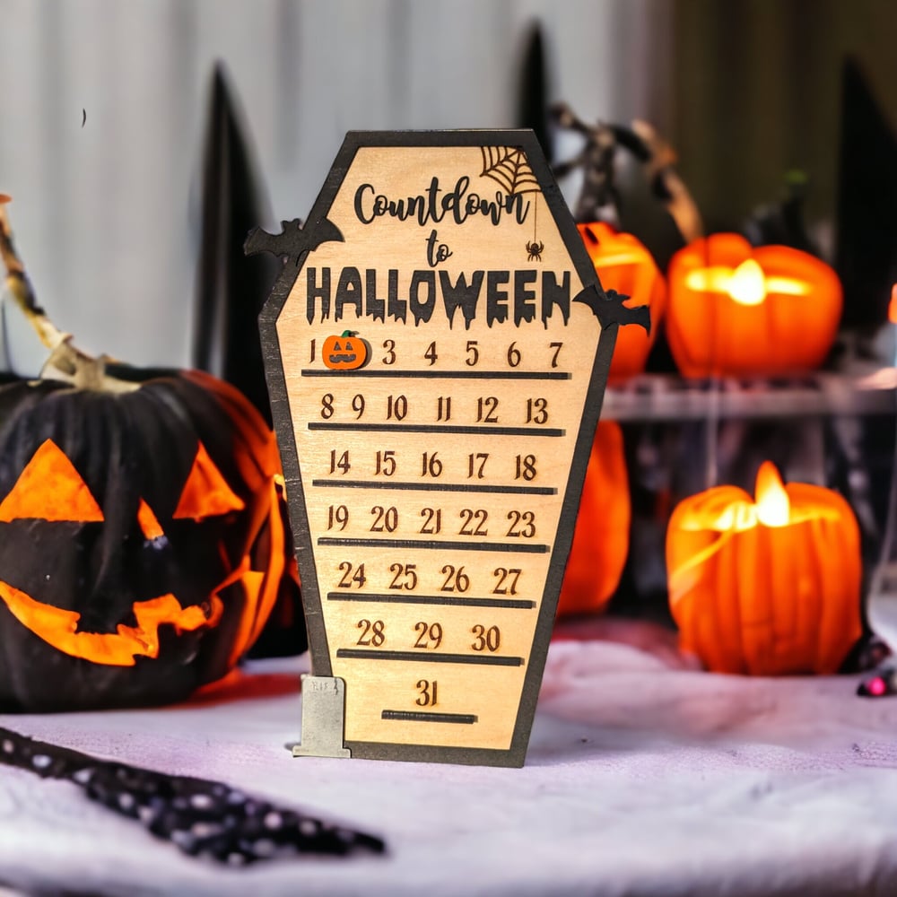 These coffin-shaped signs measure 11.75” tall and 7.6” wide, there is a detachable stand included to allow the sign to stand alone. Each countdown sign come with a Jack-O-Lantern and Ghost countdown charm. There is a choice of color for the word “Halloween” to give this sign your own personal touch!