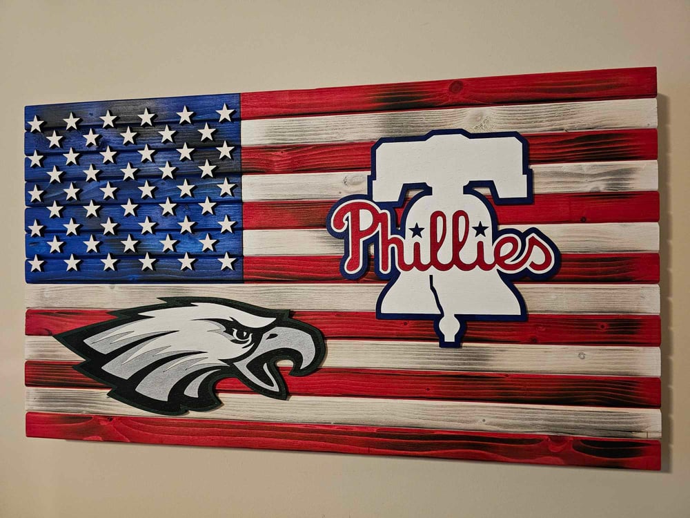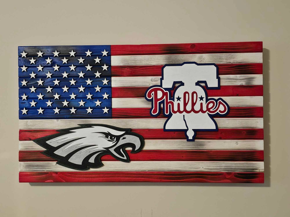 Face it, picking one favorite sport is hard… so why choose?! Allow us to introduce our multi-team American flag. Made entirely from high-quality wood, this unique piece is hand painted or stained to perfection and sealed for lasting protection. Show off your love for all your favorite sports in style with this one-of-a-kind wall décor.