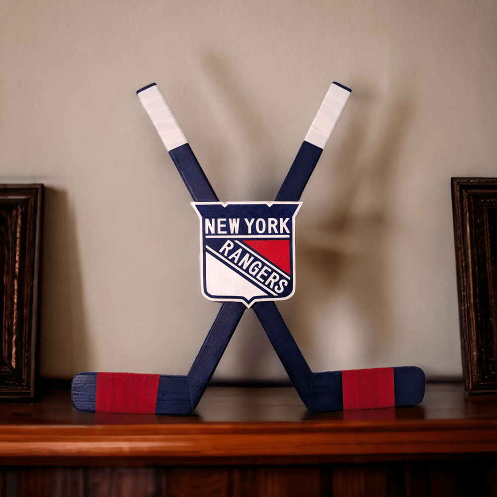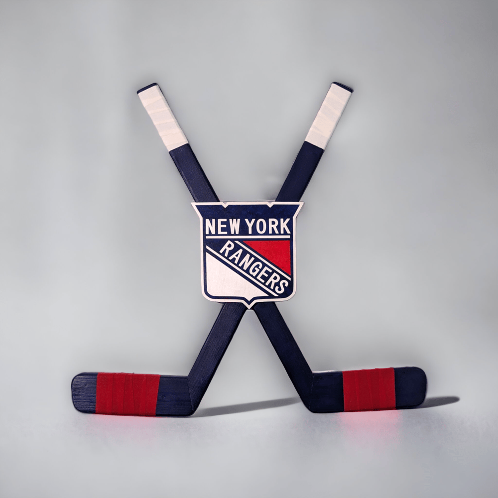 Calling all NY Rangers enthusiasts - this handmade Rangers themed wall decor is sure to please! These crossed hockey stick signs feature a hand painted Rangers themed logo in the center of the sticks.